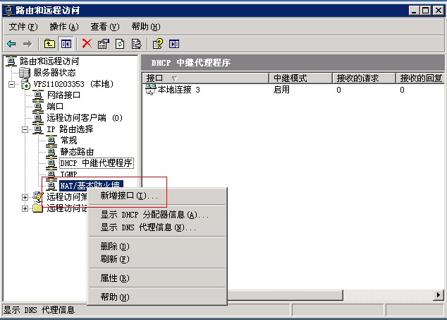 第十二步,然后右鍵點(diǎn)擊“DHCP中繼代理程序”,再點(diǎn)擊“新增接口”。