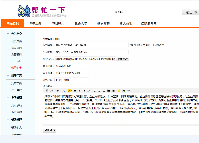 濰坊華邦網(wǎng)絡(luò)負(fù)責(zé)平臺(tái)的架構(gòu)搭建、程序發(fā)布及服務(wù)器維護(hù)。幫忙一下平臺(tái)包含廣告風(fēng)云、我求幫助等服務(wù)板塊、企業(yè)認(rèn)證板塊、會(huì)員后臺(tái)管理、城市分站判斷跳轉(zhuǎn)、支付寶在線支付板塊等,是綜合性很強(qiáng)的即時(shí)信息服務(wù)門戶。