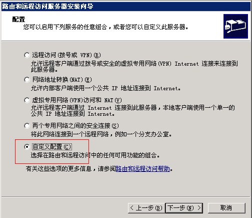 第三步,在“路由和遠(yuǎn)程服務(wù)器安裝向?qū)А敝?,選擇“自定義配置”。