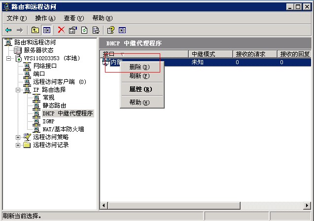 第十一步,刪除“DHCP中繼代理程序”中的“內(nèi)部”項(xiàng)目。