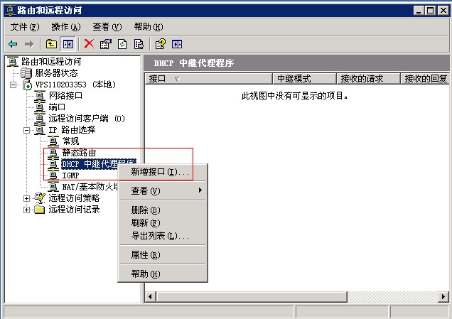 第十二步,然后右鍵點(diǎn)擊“DHCP中繼代理程序”,再點(diǎn)擊“新增接口”。