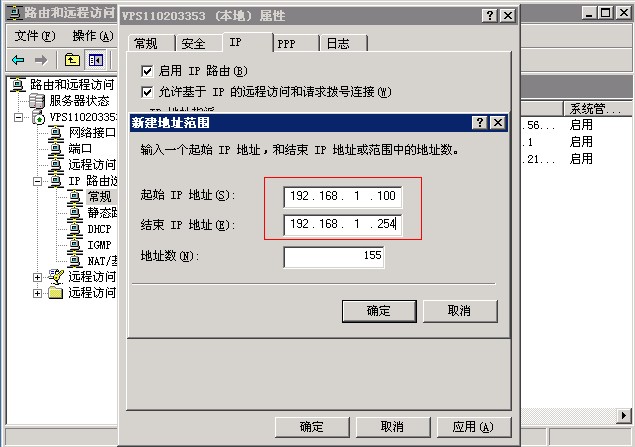 第八步,點(diǎn)選“靜態(tài)地址池”,點(diǎn)擊“添加”。輸入一個(gè)起始IP地址和結(jié)束IP地址范圍,推薦輸入192.168.1.100到192.168.1.254這個(gè)范圍,因?yàn)?92.168段屬于本地保留IP段。最后點(diǎn)擊“確定”。