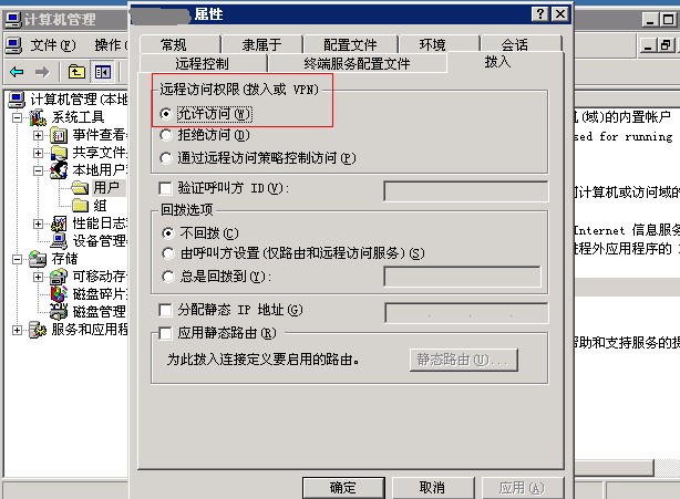 第十六步,至此在路由和遠(yuǎn)程訪問(wèn)中的配置就完成了。下面是添加VPN用戶的步驟,到計(jì)算機(jī)管理中添加一個(gè)用戶,作為VPN連接的用戶,把這個(gè)用戶放到Guest組下面,并在用戶屬性->撥入->遠(yuǎn)程訪問(wèn)權(quán)限中設(shè)置成“允許訪問(wèn)”。 然后就是在你自己電腦上新建VPN連接,進(jìn)行撥號(hào)測(cè)試了。要確定是否連接成功,請(qǐng)?jiān)L問(wèn)http://www.ip138.com等IP查詢網(wǎng)站,看是否顯示的是國(guó)外服務(wù)器的IP即可。