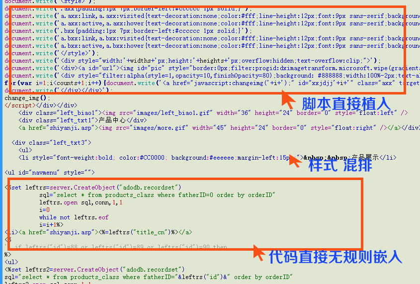 以下代碼截圖是某裝飾公司網(wǎng)站代碼代碼,該裝飾公司在行業(yè)內(nèi)知名度名較高 交換友鏈的時候發(fā)現(xiàn)他們的網(wǎng)站出現(xiàn)錯位,于是老板提出幫忙看一下代碼,處于好心幫著修正了一下部分代碼,不過整個網(wǎng)站的代碼可以用一個詞形容 慘不忍睹,上圖有真相